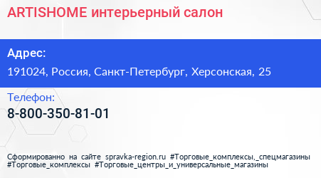ARTISHOME, интерьерный салон по адресу 191024, Россия, Санкт-Петербург, Херсонская, 25 в дальнейшем Организация, размещена в следующих категориях: