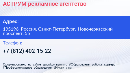 АСТРУМ, рекламное агентство по адресу 195196, Россия, Санкт-Петербург, Новочеркасский проспект, 55 в дальнейшем Организация, размещена в следующих категориях: