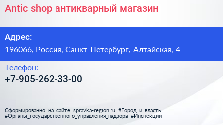 Antic shop, антикварный магазин по адресу 196066, Россия, Санкт-Петербург, Алтайская, 4 в дальнейшем Организация, размещена в следующих категориях: