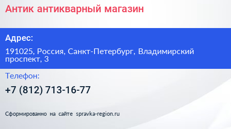 Антик, антикварный магазин по адресу 191025, Россия, Санкт-Петербург, Владимирский проспект, 3 в дальнейшем Организация, размещена в следующих категориях: