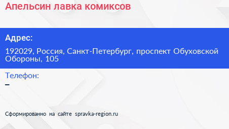 Апельсин, лавка комиксов по адресу 192029, Россия, Санкт-Петербург, проспект Обуховской Обороны, 105 в дальнейшем Организация, размещена в следующих категориях: