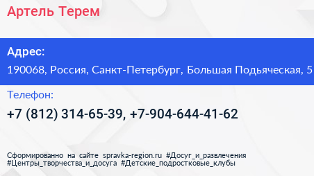 Артель Терем по адресу 190068, Россия, Санкт-Петербург, Большая Подьяческая, 5 в дальнейшем Организация, размещена в следующих категориях: