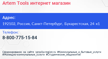 Artem Tools, интернет-магазин по адресу 192102, Россия, Санкт-Петербург, Бухарестская, 24 к1 в дальнейшем Организация, размещена в следующих категориях: