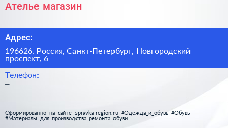 Ателье-магазин по адресу 196626, Россия, Санкт-Петербург, Новгородский проспект, 6 в дальнейшем Организация, размещена в следующих категориях: