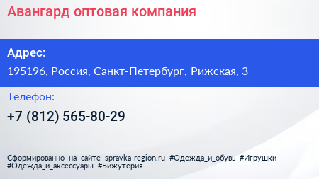 Авангард, оптовая компания по адресу 195196, Россия, Санкт-Петербург, Рижская, 3 в дальнейшем Организация, размещена в следующих категориях: