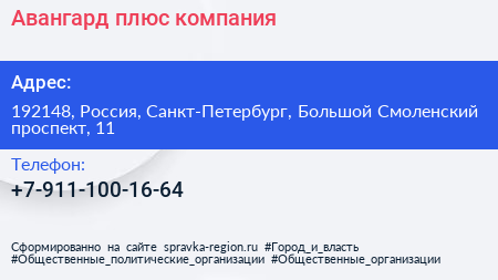 Авангард плюс, компания по адресу 192148, Россия, Санкт-Петербург, Большой Смоленский проспект, 11 в дальнейшем Организация, размещена в следующих категориях: