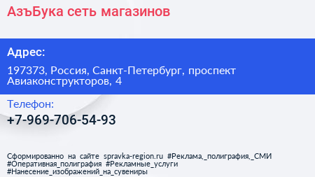 АзъБука, сеть магазинов по адресу 197373, Россия, Санкт-Петербург, проспект Авиаконструкторов, 4 в дальнейшем Организация, размещена в следующих категориях: