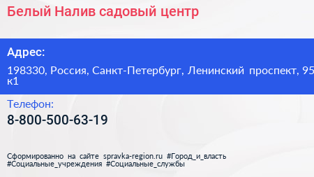 Белый Налив, садовый центр по адресу 198330, Россия, Санкт-Петербург, Ленинский проспект, 95 к1 в дальнейшем Организация, размещена в следующих категориях: