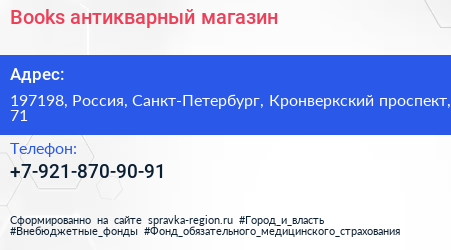 Books, антикварный магазин по адресу 197198, Россия, Санкт-Петербург, Кронверкский проспект, 71 в дальнейшем Организация, размещена в следующих категориях: