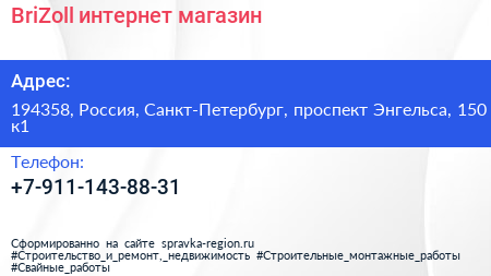 BriZoll, интернет-магазин по адресу 194358, Россия, Санкт-Петербург, проспект Энгельса, 150 к1 в дальнейшем Организация, размещена в следующих категориях: