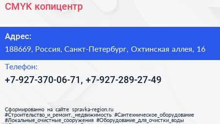 CMYK, копицентр по адресу 188669, Россия, Санкт-Петербург, Охтинская аллея, 16 в дальнейшем Организация, размещена в следующих категориях: