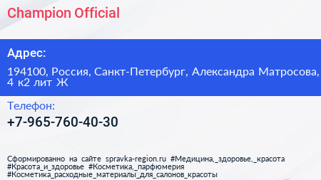 Champion Official по адресу 194100, Россия, Санкт-Петербург, Александра Матросова, 4 к2 лит Ж в дальнейшем Организация, размещена в следующих категориях: