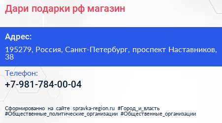 Дари-подарки.рф, магазин по адресу 195279, Россия, Санкт-Петербург, проспект Наставников, 38 в дальнейшем Организация, размещена в следующих категориях: