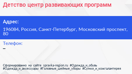 Детство, центр развивающих программ по адресу 196084, Россия, Санкт-Петербург, Московский проспект, 80 в дальнейшем Организация, размещена в следующих категориях: