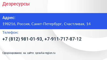 Дезресурсы по адресу 198216, Россия, Санкт-Петербург, Счастливая, 14 в дальнейшем Организация, размещена в следующих категориях:
