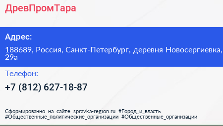 ДревПромТара по адресу 188689, Россия, Санкт-Петербург, деревня Новосергиевка, 29а в дальнейшем Организация, размещена в следующих категориях: