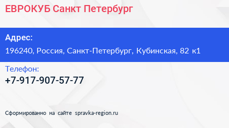 ЕВРОКУБ-Санкт-Петербург по адресу 196240, Россия, Санкт-Петербург, Кубинская, 82 к1 в дальнейшем Организация, размещена в следующих категориях: