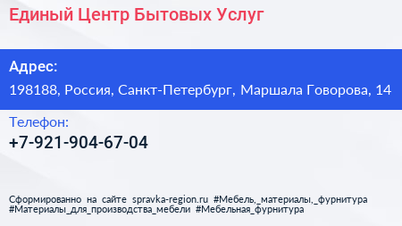 Единый Центр Бытовых Услуг по адресу 198188, Россия, Санкт-Петербург, Маршала Говорова, 14 в дальнейшем Организация, размещена в следующих категориях: