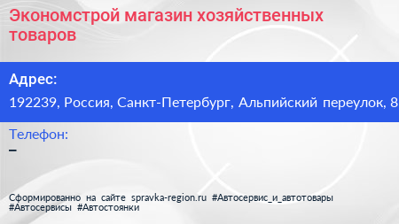 Экономстрой, магазин хозяйственных товаров по адресу 192239, Россия, Санкт-Петербург, Альпийский переулок, 8 в дальнейшем Организация, размещена в следующих категориях: