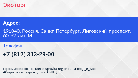 Экоторг по адресу 191040, Россия, Санкт-Петербург, Лиговский проспект, 60-62 лит М в дальнейшем Организация, размещена в следующих категориях: