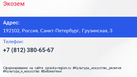 Экозем по адресу 192102, Россия, Санкт-Петербург, Грузинская, 3 в дальнейшем Организация, размещена в следующих категориях: