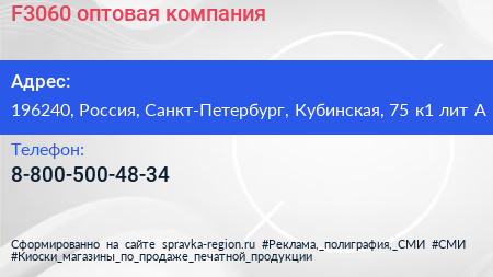 F3060, оптовая компания по адресу 196240, Россия, Санкт-Петербург, Кубинская, 75 к1 лит А в дальнейшем Организация, размещена в следующих категориях: