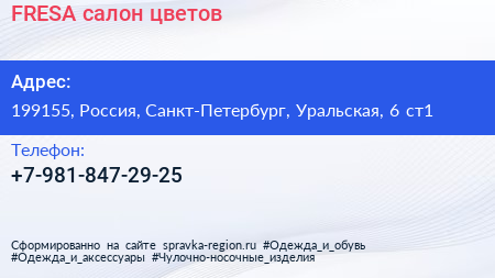 FRESA, салон цветов по адресу 199155, Россия, Санкт-Петербург, Уральская, 6 ст1 в дальнейшем Организация, размещена в следующих категориях: