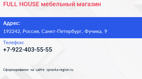 FULL HOUSE, мебельный магазин по адресу 192242, Россия, Санкт-Петербург, Фучика, 9 в дальнейшем Организация, размещена в следующих категориях: