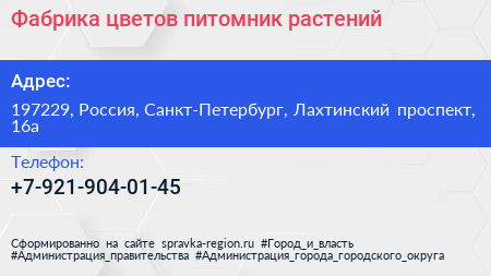 Фабрика цветов, питомник растений по адресу 197229, Россия, Санкт-Петербург, Лахтинский проспект, 16а в дальнейшем Организация, размещена в следующих категориях: