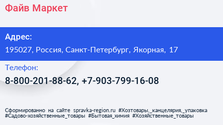 Файв Маркет по адресу 195027, Россия, Санкт-Петербург, Якорная, 17 в дальнейшем Организация, размещена в следующих категориях: