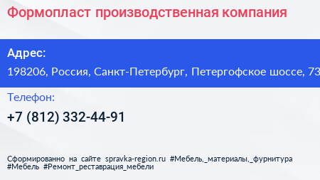 Формопласт, производственная компания по адресу 198206, Россия, Санкт-Петербург, Петергофское шоссе, 73 в дальнейшем Организация, размещена в следующих категориях:
