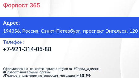 Форпост 365 по адресу 194356, Россия, Санкт-Петербург, проспект Энгельса, 120 в дальнейшем Организация, размещена в следующих категориях: