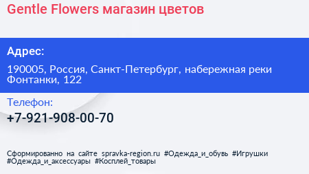 Gentle Flowers, магазин цветов по адресу 190005, Россия, Санкт-Петербург, набережная реки Фонтанки, 122 в дальнейшем Организация, размещена в следующих категориях: