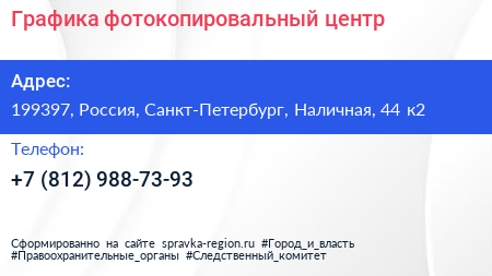 Графика, фотокопировальный центр по адресу 199397, Россия, Санкт-Петербург, Наличная, 44 к2 в дальнейшем Организация, размещена в следующих категориях:
