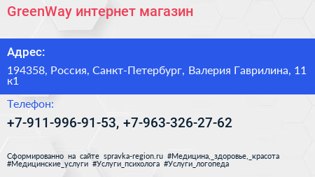 GreenWay, интернет-магазин по адресу 194358, Россия, Санкт-Петербург, Валерия Гаврилина, 11 к1 в дальнейшем Организация, размещена в следующих категориях: