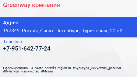 Greenway, компания по адресу 197345, Россия, Санкт-Петербург, Туристская, 20 к2 в дальнейшем Организация, размещена в следующих категориях: