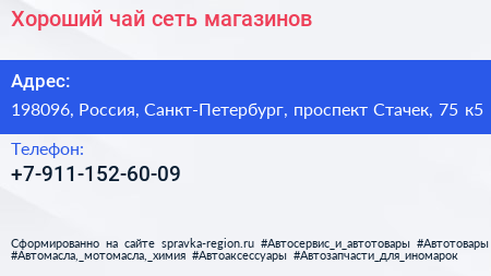 Хороший чай, сеть магазинов по адресу 198096, Россия, Санкт-Петербург, проспект Стачек, 75 к5 в дальнейшем Организация, размещена в следующих категориях: