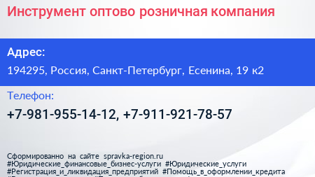 Инструмент, оптово-розничная компания по адресу 194295, Россия, Санкт-Петербург, Есенина, 19 к2 в дальнейшем Организация, размещена в следующих категориях: