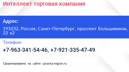 Интеллект, торговая компания по адресу 193232, Россия, Санкт-Петербург, проспект Большевиков, 22 к2 в дальнейшем Организация, размещена в следующих категориях: