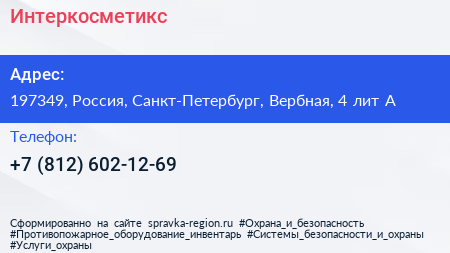 Интеркосметикс по адресу 197349, Россия, Санкт-Петербург, Вербная, 4 лит А в дальнейшем Организация, размещена в следующих категориях: