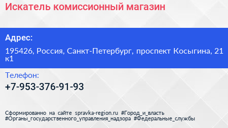 Искатель, комиссионный магазин по адресу 195426, Россия, Санкт-Петербург, проспект Косыгина, 21 к1 в дальнейшем Организация, размещена в следующих категориях: