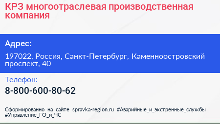 КРЗ, многоотраслевая производственная компания по адресу 197022, Россия, Санкт-Петербург, Каменноостровский проспект, 40 в дальнейшем Организация, размещена в следующих категориях: