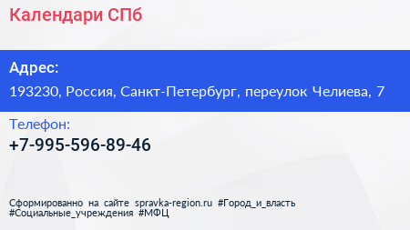 Календари-СПб по адресу 193230, Россия, Санкт-Петербург, переулок Челиева, 7 в дальнейшем Организация, размещена в следующих категориях: