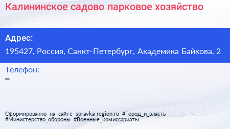 Калининское садово-парковое хозяйство по адресу 195427, Россия, Санкт-Петербург, Академика Байкова, 2 в дальнейшем Организация, размещена в следующих категориях: