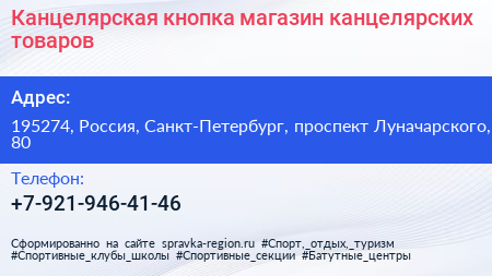 Канцелярская кнопка, магазин канцелярских товаров по адресу 195274, Россия, Санкт-Петербург, проспект Луначарского, 80 в дальнейшем Организация, размещена в следующих категориях:
