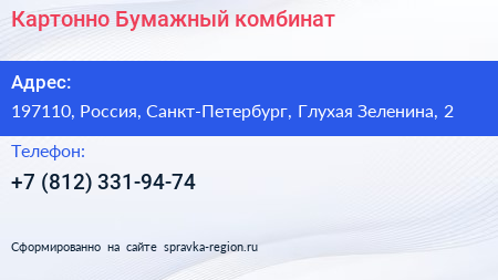 Картонно-Бумажный комбинат по адресу 197110, Россия, Санкт-Петербург, Глухая Зеленина, 2 в дальнейшем Организация, размещена в следующих категориях: