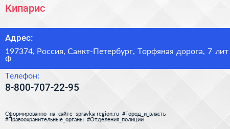 Кипарис по адресу 197374, Россия, Санкт-Петербург, Торфяная дорога, 7 лит Ф в дальнейшем Организация, размещена в следующих категориях: