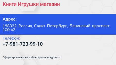 Книги-Игрушки, магазин по адресу 198332, Россия, Санкт-Петербург, Ленинский проспект, 100 к2 в дальнейшем Организация, размещена в следующих категориях: