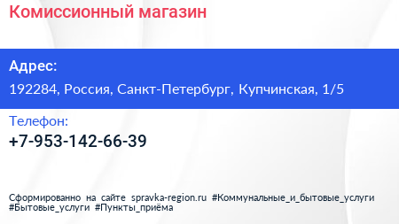 Комиссионный магазин по адресу 192284, Россия, Санкт-Петербург, Купчинская, 1/5 в дальнейшем Организация, размещена в следующих категориях: