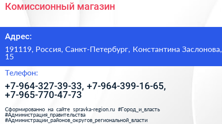 Комиссионный магазин по адресу 191119, Россия, Санкт-Петербург, Константина Заслонова, 15 в дальнейшем Организация, размещена в следующих категориях: